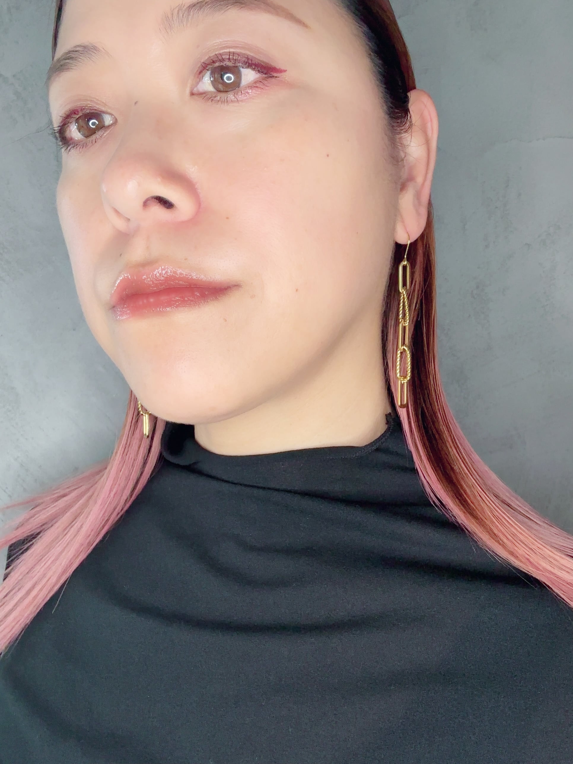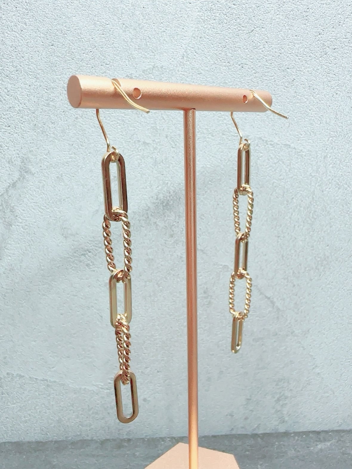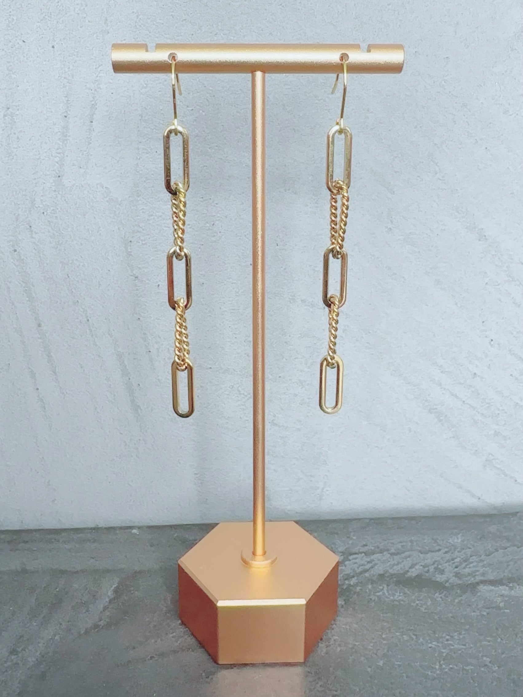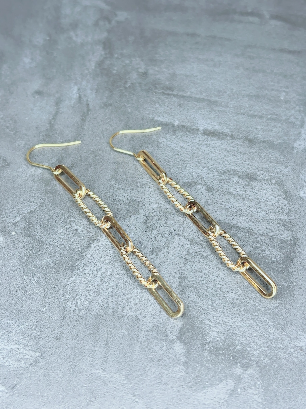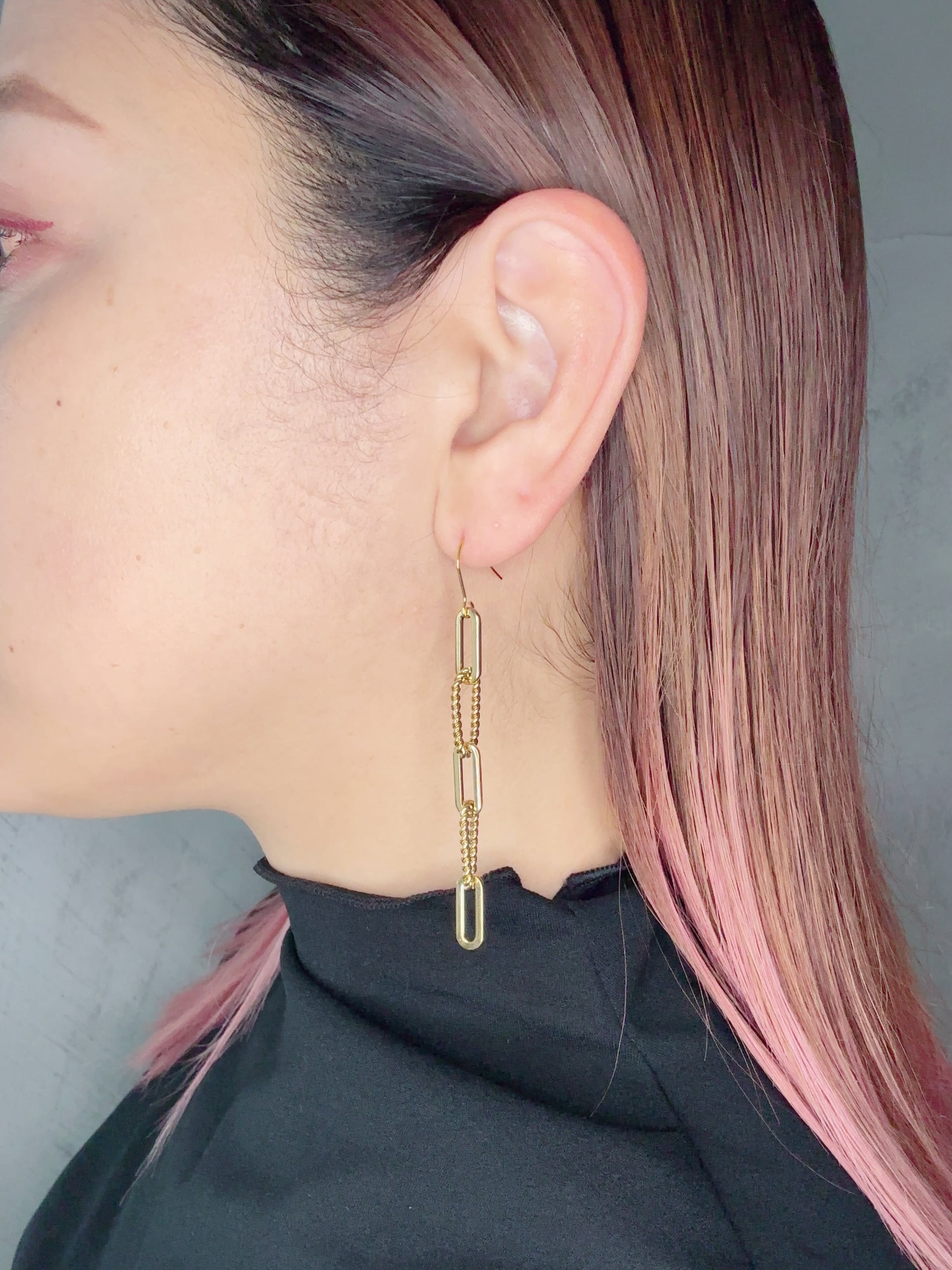 直線的なゴールドチェーンと表情のあるツイストチェーンを連ねたロングピアスです。
