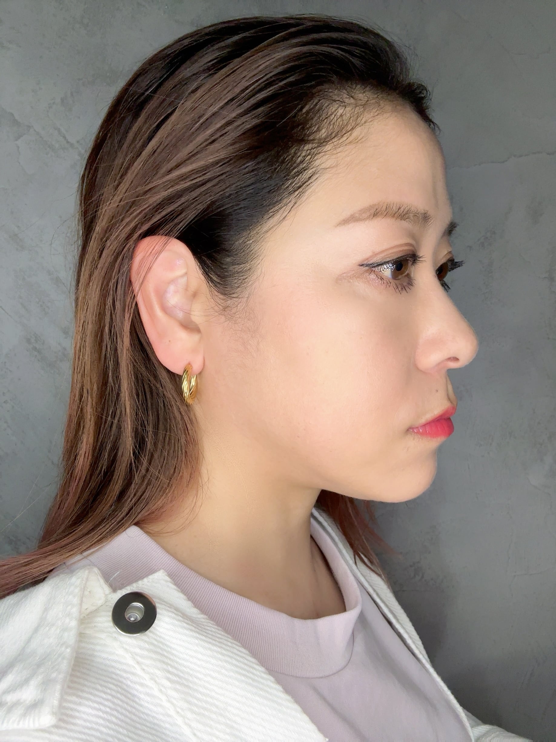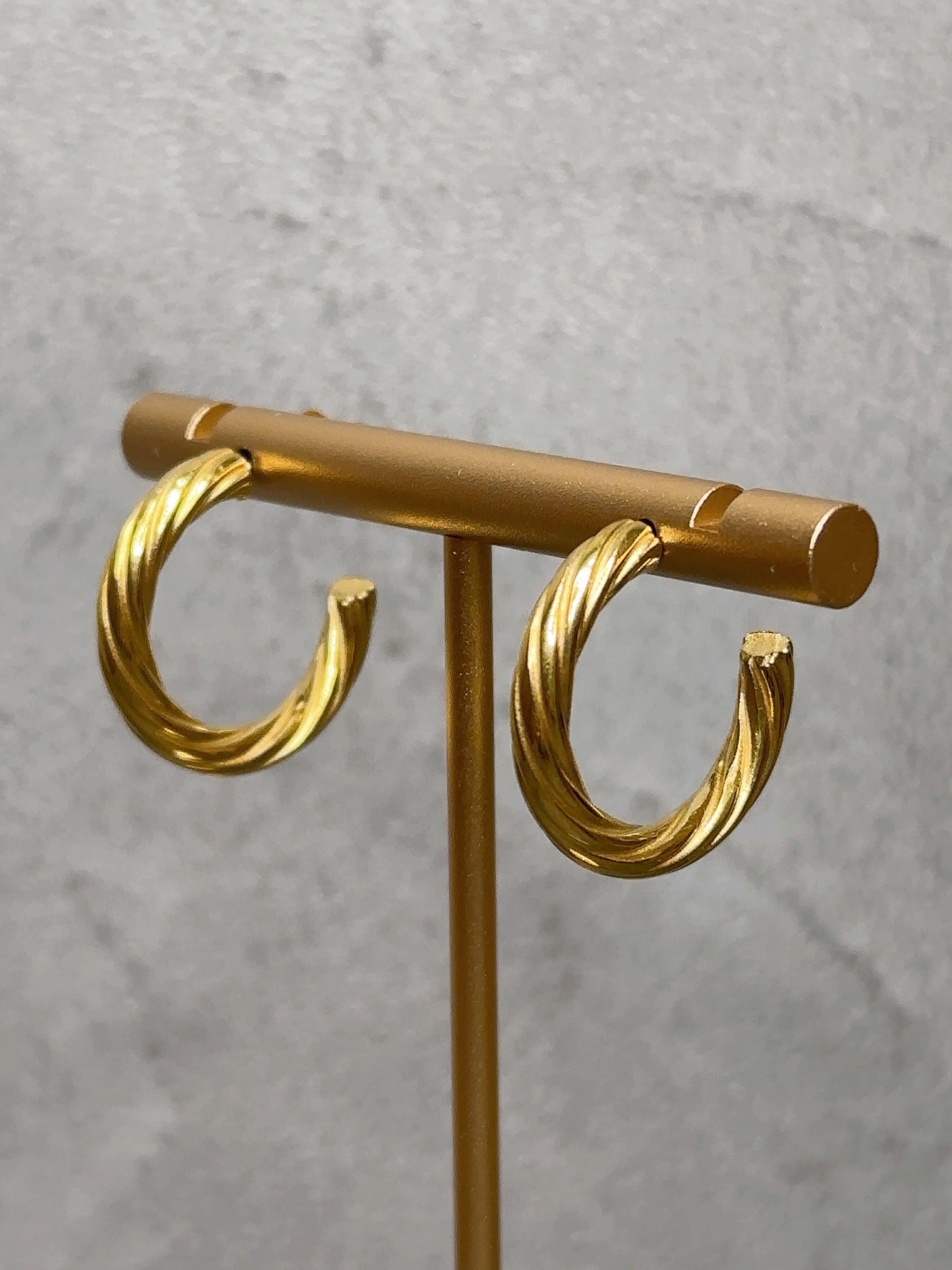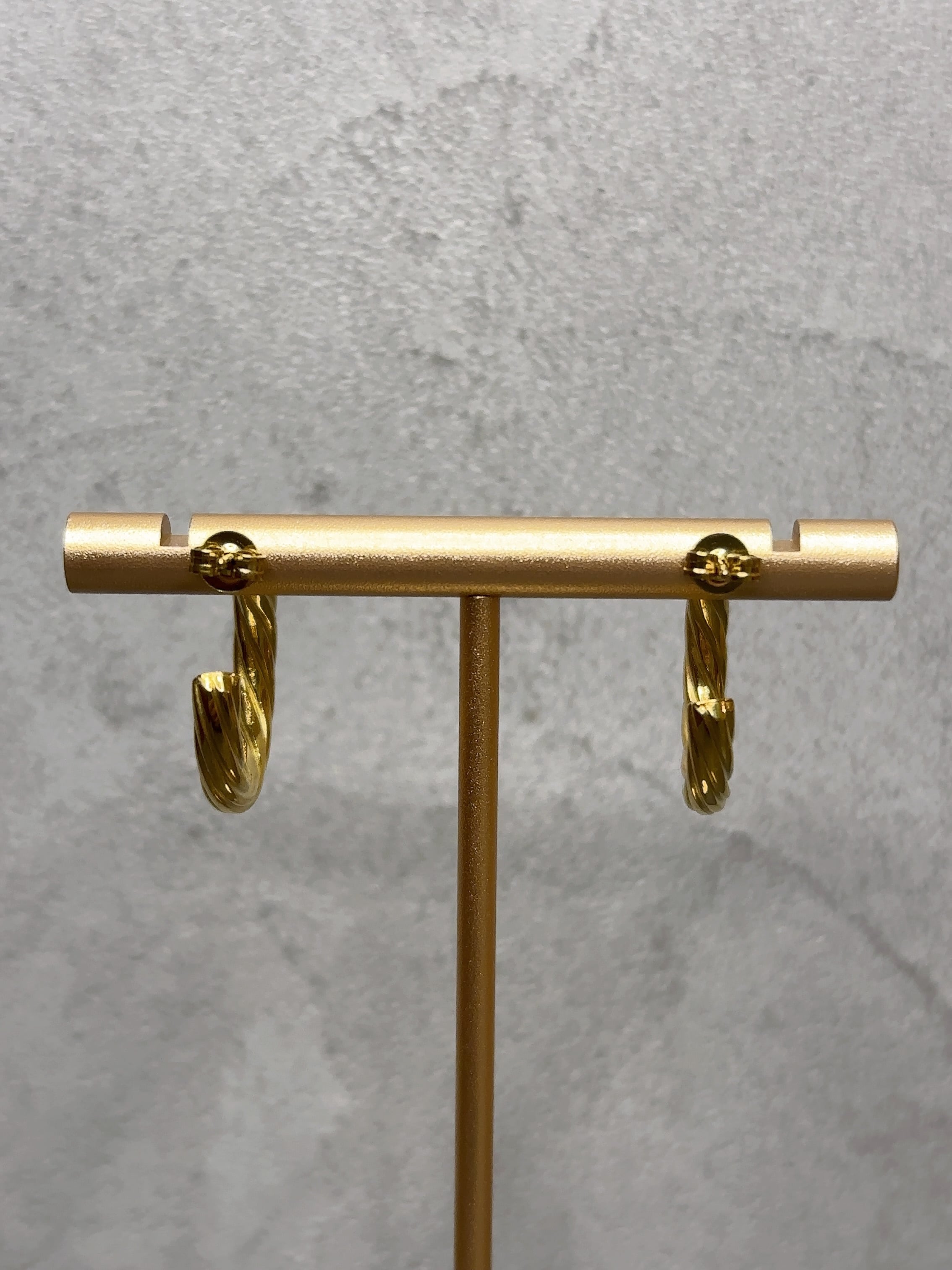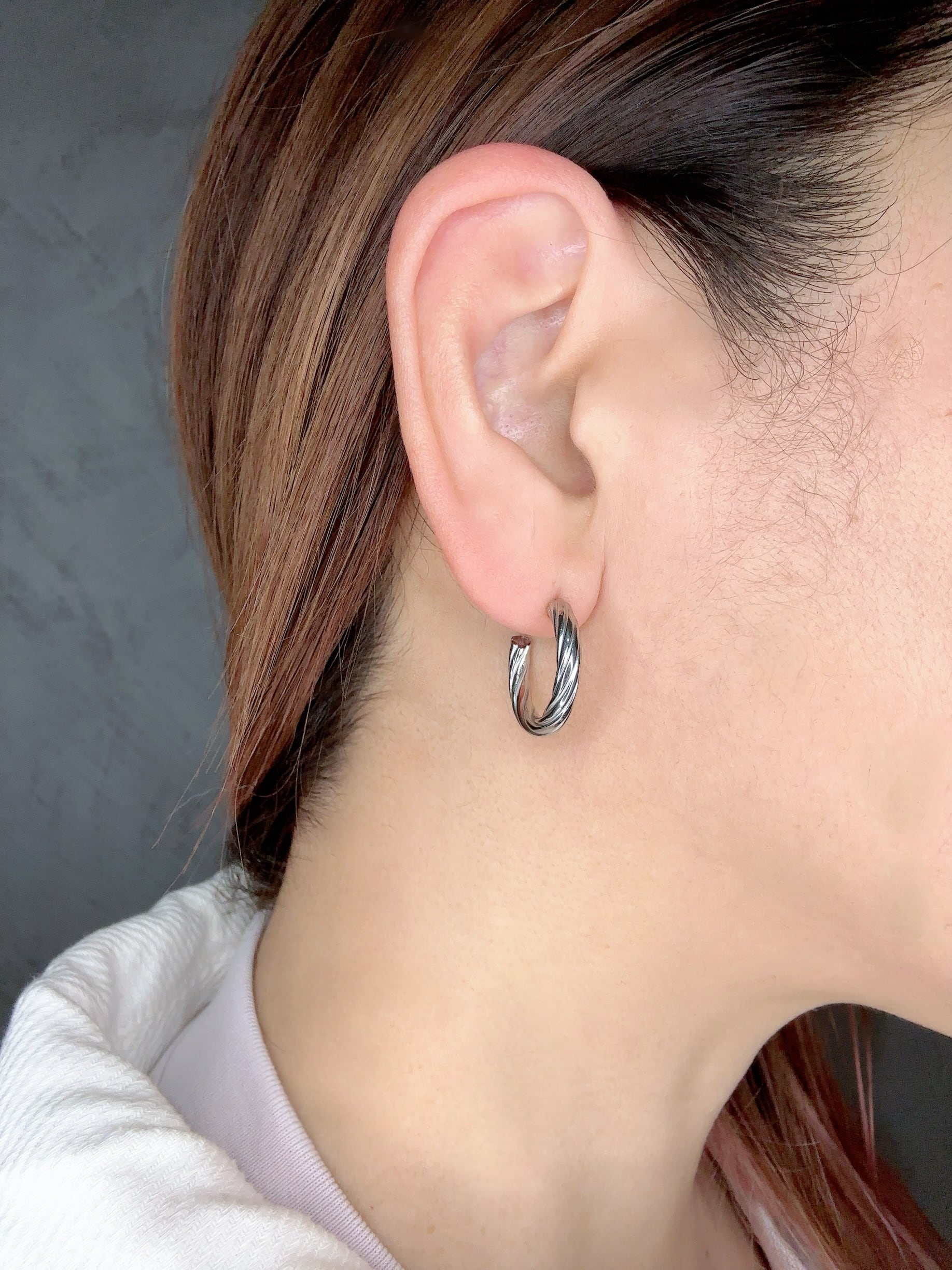 立体的にねじりを加えたフォルムが光を受けるたびに美しく輝き、シンプルなフープに奥行きのある表情を与えてくれます。