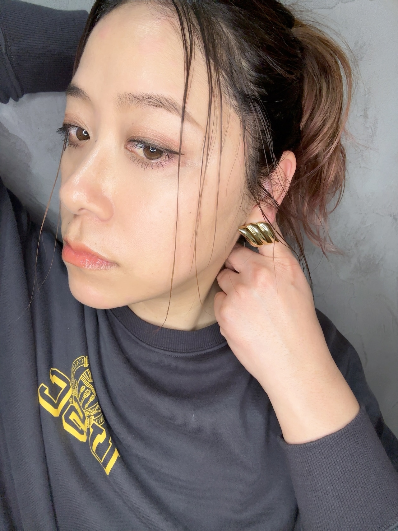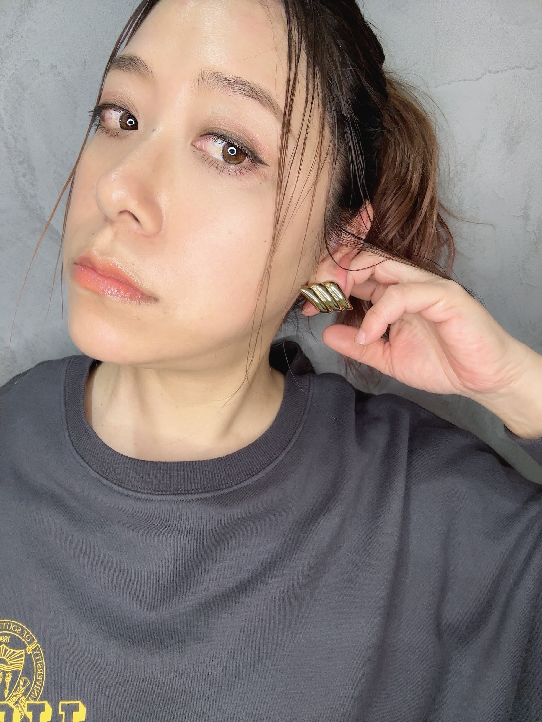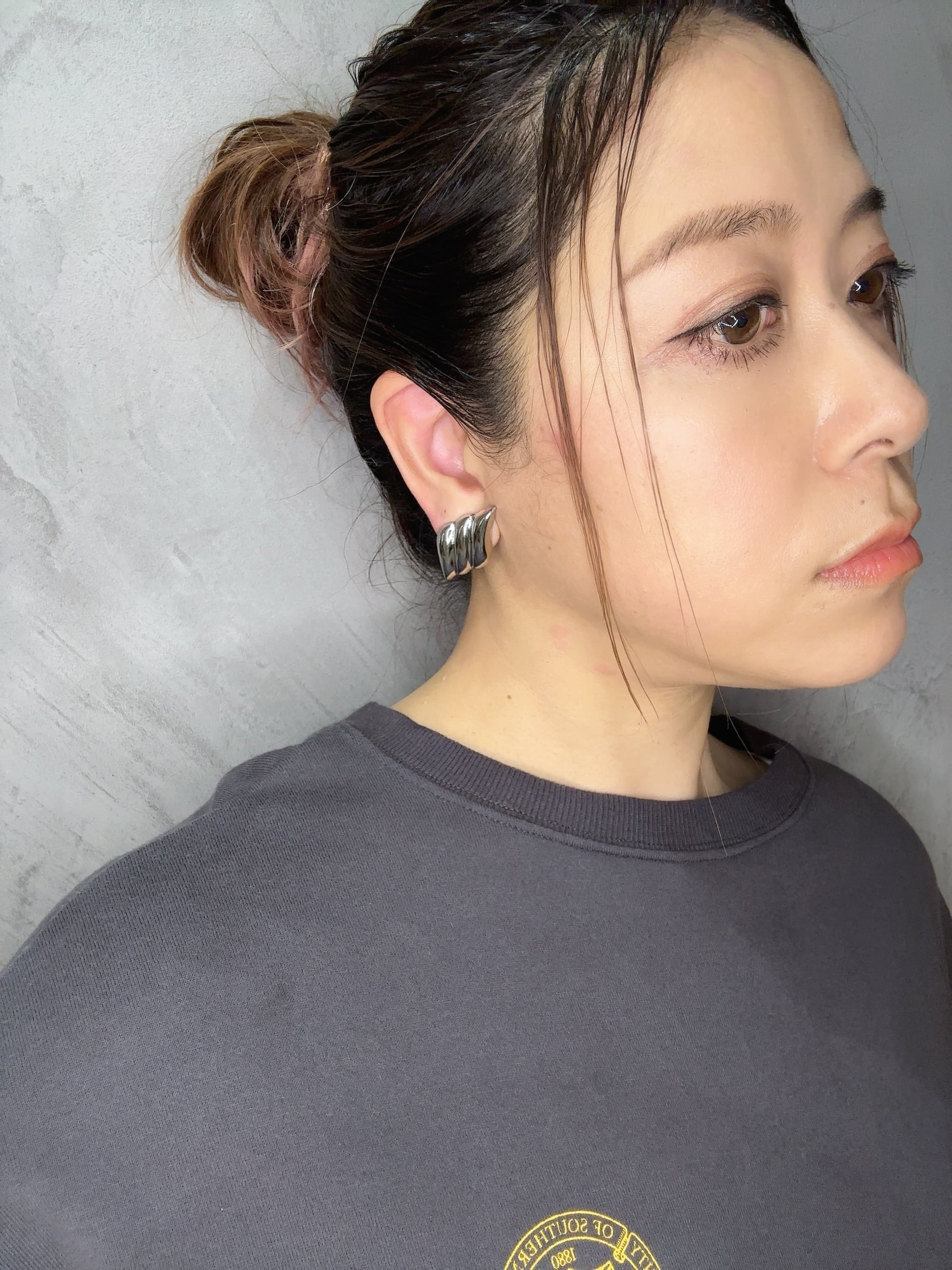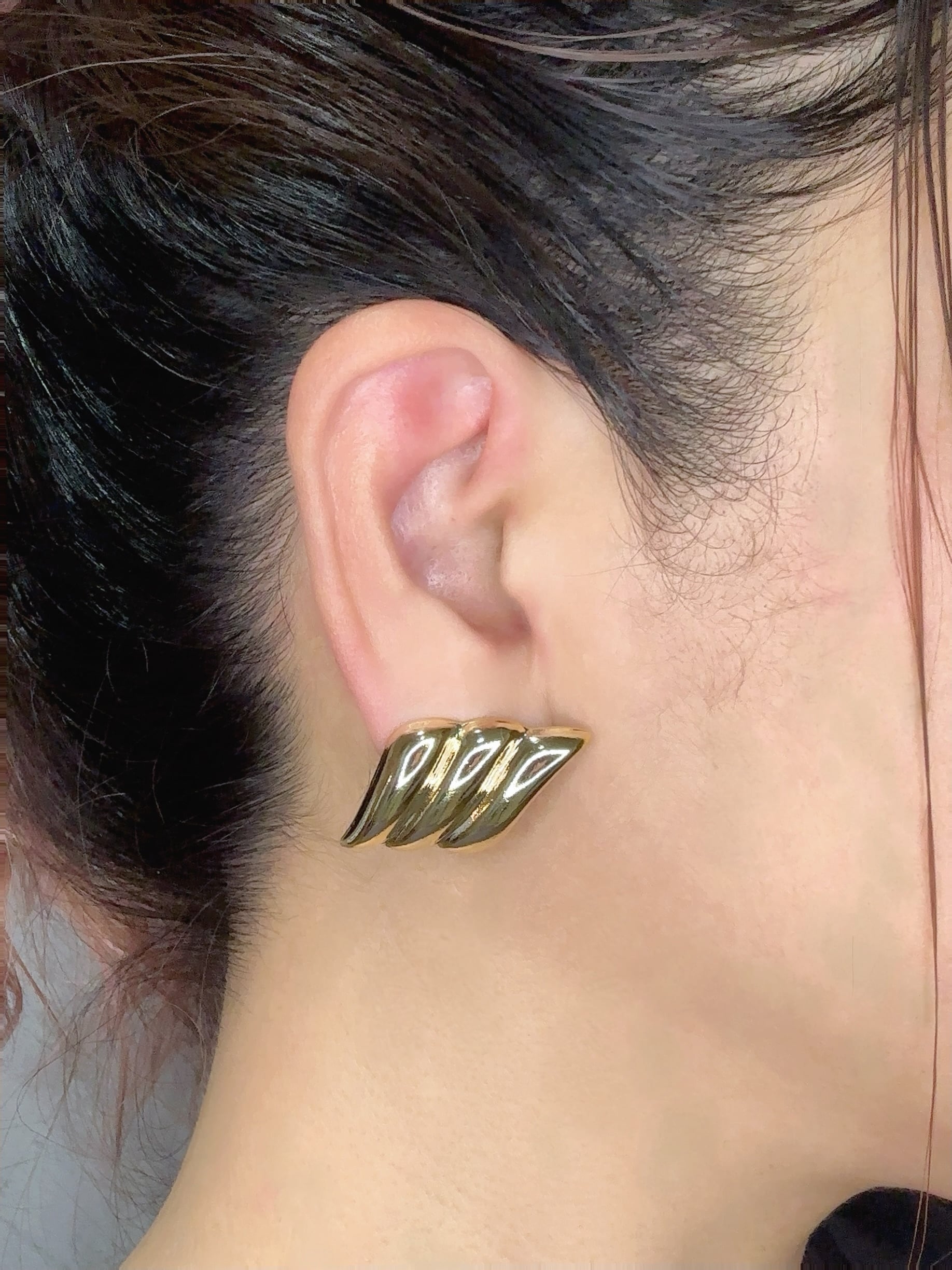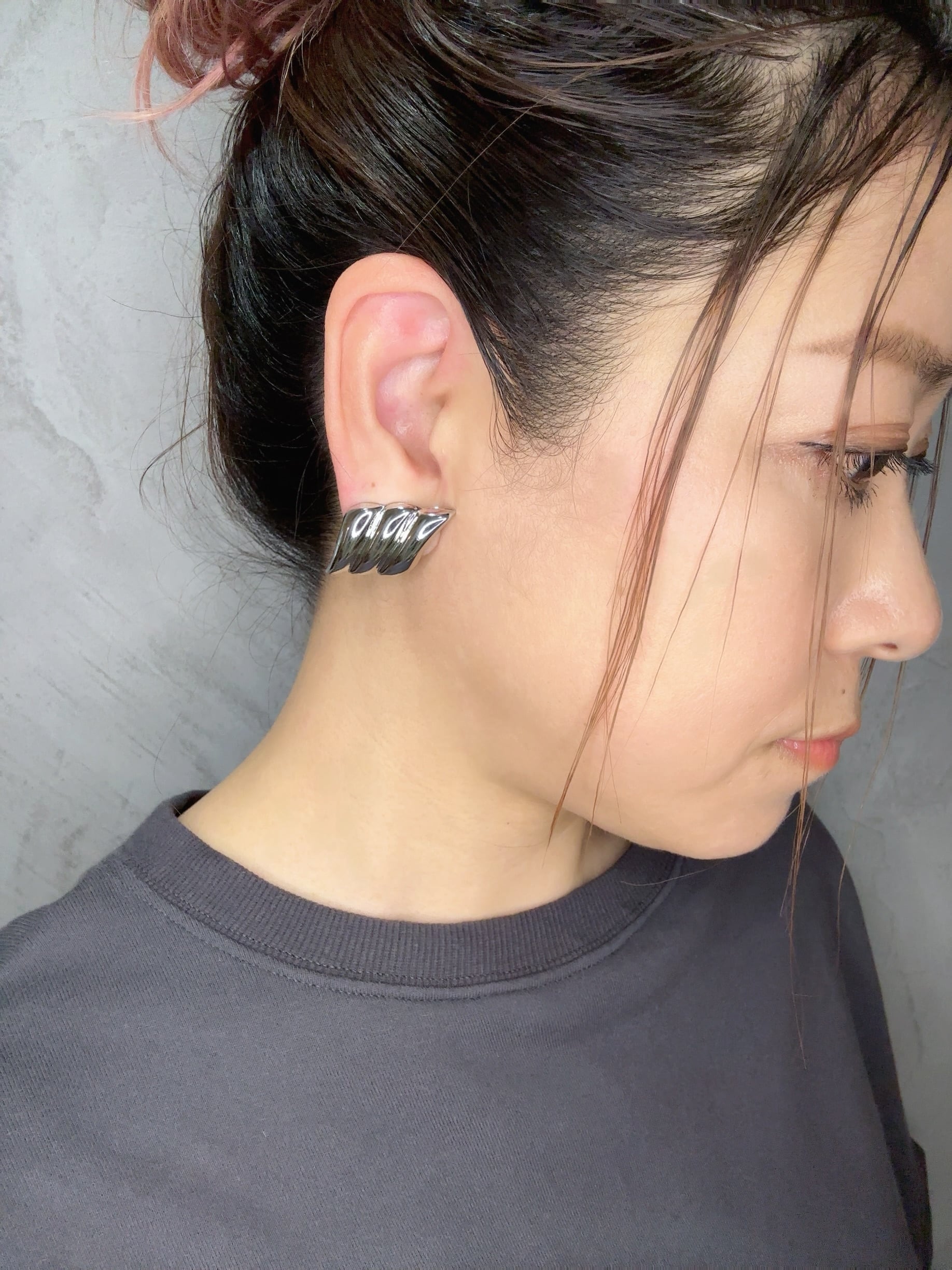 ふんわりと重なる曲線が雲のような柔らかな立体フォルムを描き、艶やかなメタルが光を受けて顔まわりをさりげなく華やかに彩ります。